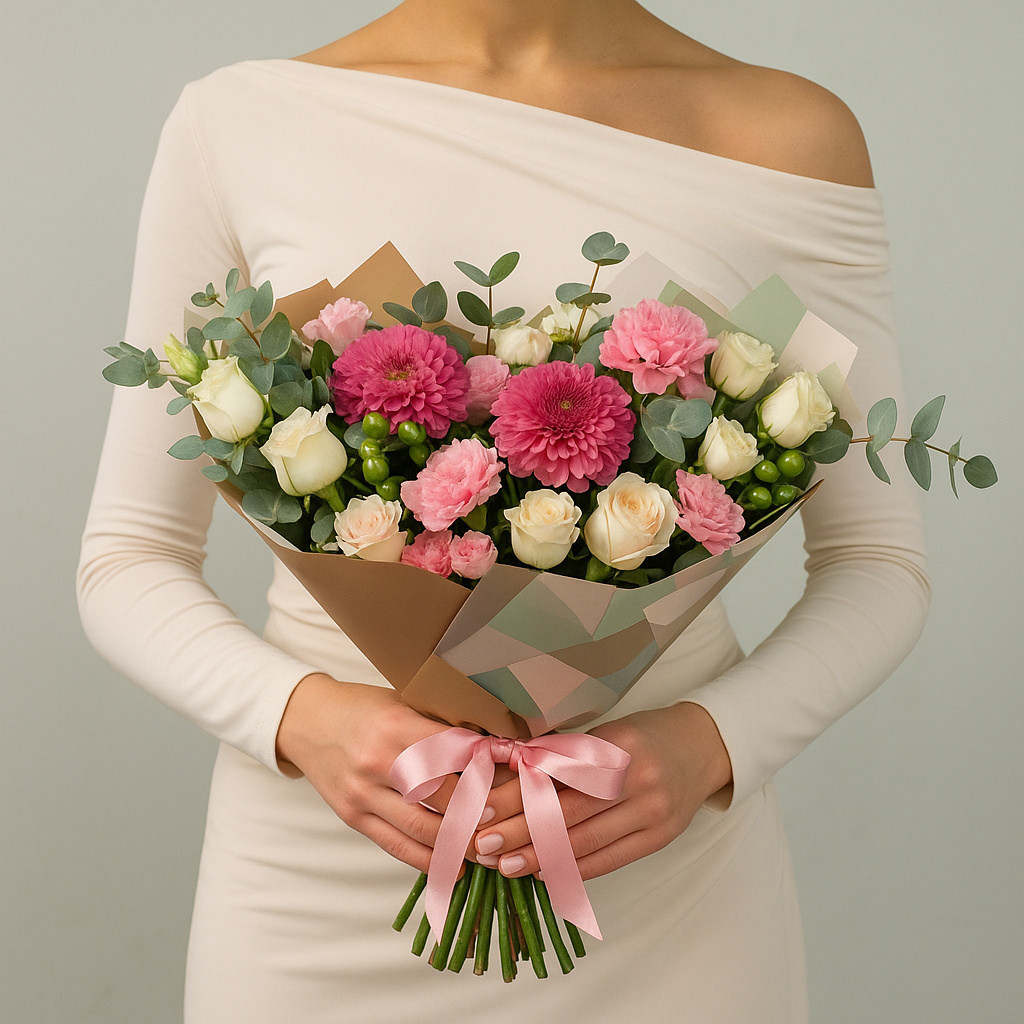 Изящный букет в пастельных оттенках с акцентом на розовые георгины — это воплощение нежности и элегантности. Композиция наполнена свежестью и гармонией, идеально подойдёт для поздравлений и романтичных моментов.