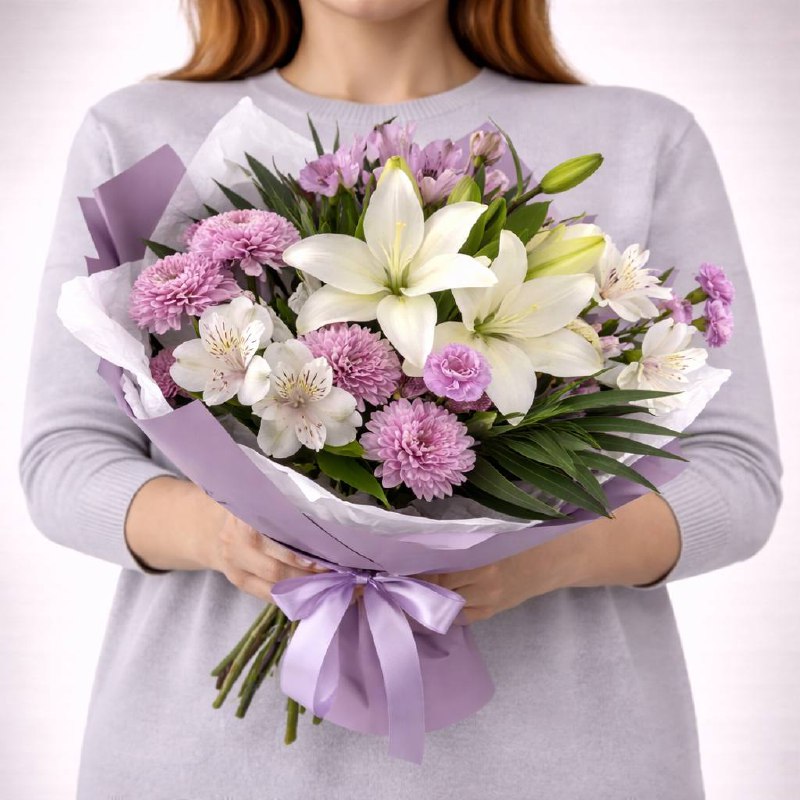 | Состав: | Альстромерии, Гвоздики, Лилии, Хризантемы |