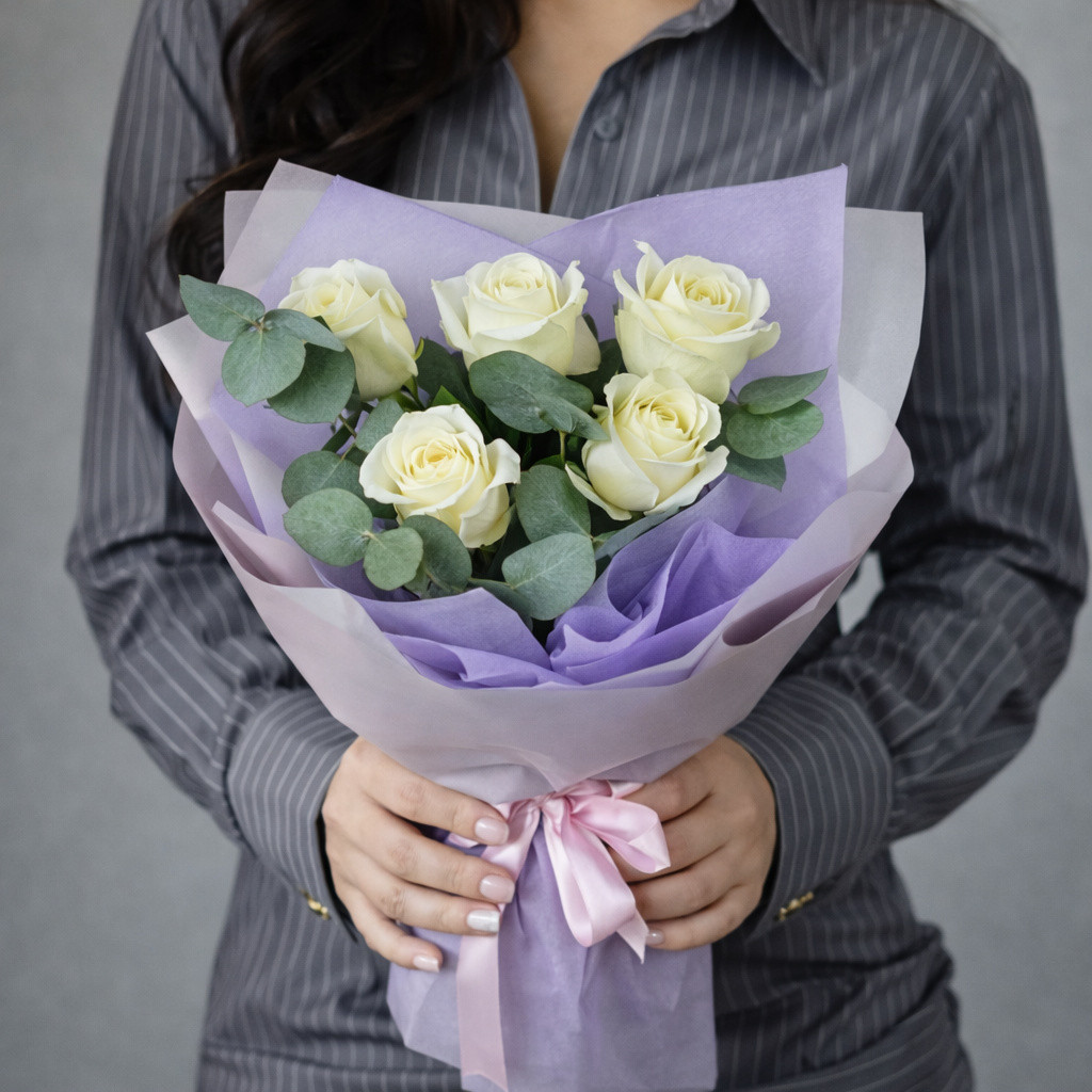 Изысканный букет из пяти нежных белых роз — это символ чистоты, искренности и утончённой элегантности. Лаконичный и воздушный, он наполняет пространство светом и спокойствием, подчёркивая особое отношение к получателю. Такой букет идеально подойдёт для признания, знака внимания, поздравления или тёплого жеста без лишних слов.