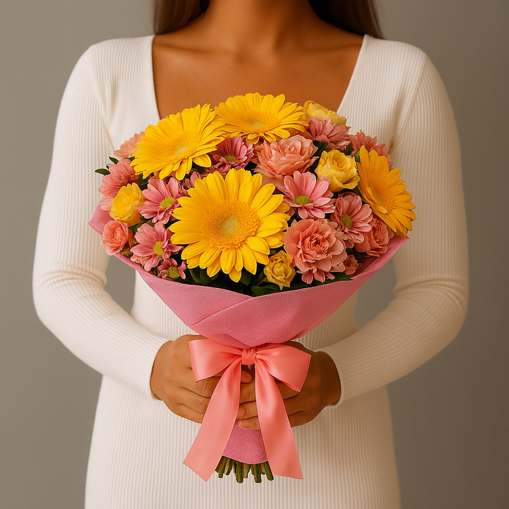 Солнечные жёлтые герберы сияют на фоне нежно-розовых хризантем и роз, создавая эффект тёплого заката. Живая, яркая и очень фотогеничная композиция — чтобы подарить радость и внимание без лишних слов.