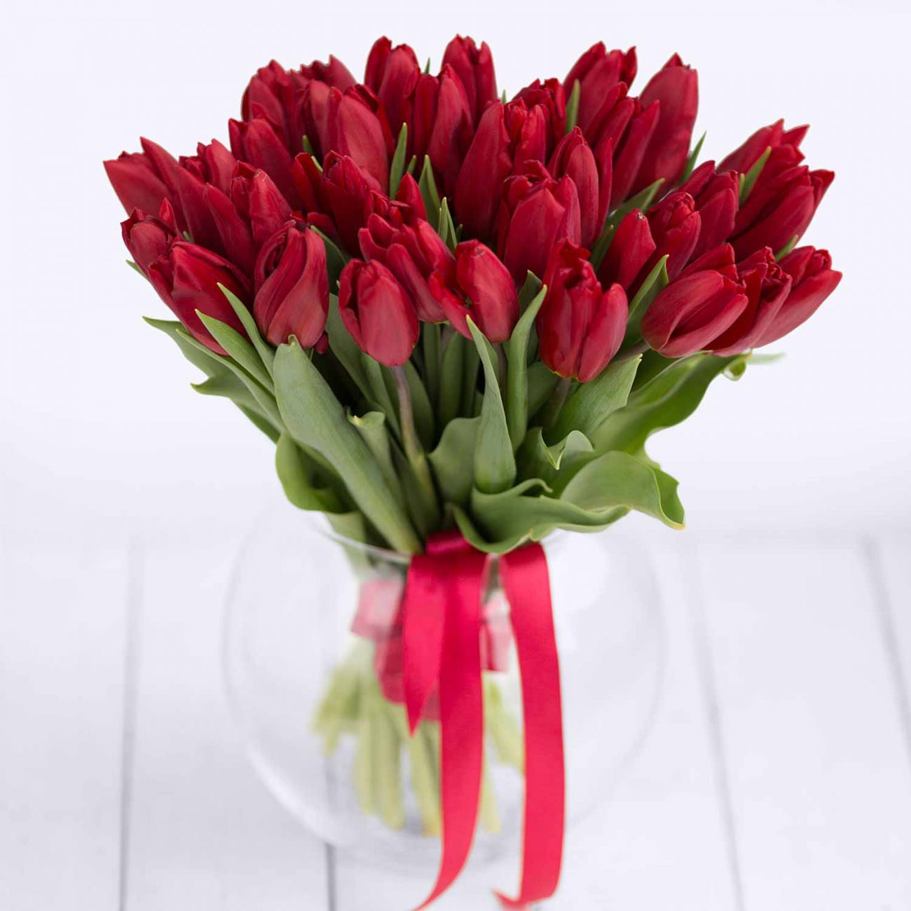Букет красных тюльпанов под ленту — 35 штук
