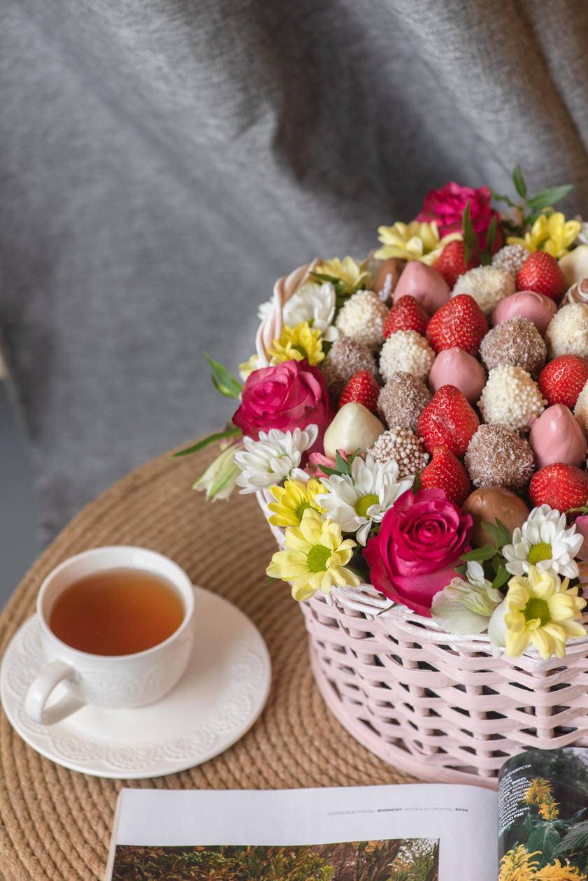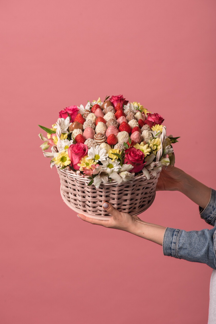 Корзина которая собрала в себя всю любовь, прекрасные оттенки ярко-розового цвета и нежнейшей хризантемы. Клубника в шоколаде марки Callebaut придает ягодам сладкие, изысканные нотки настоящего шоколада родом из Бельгии