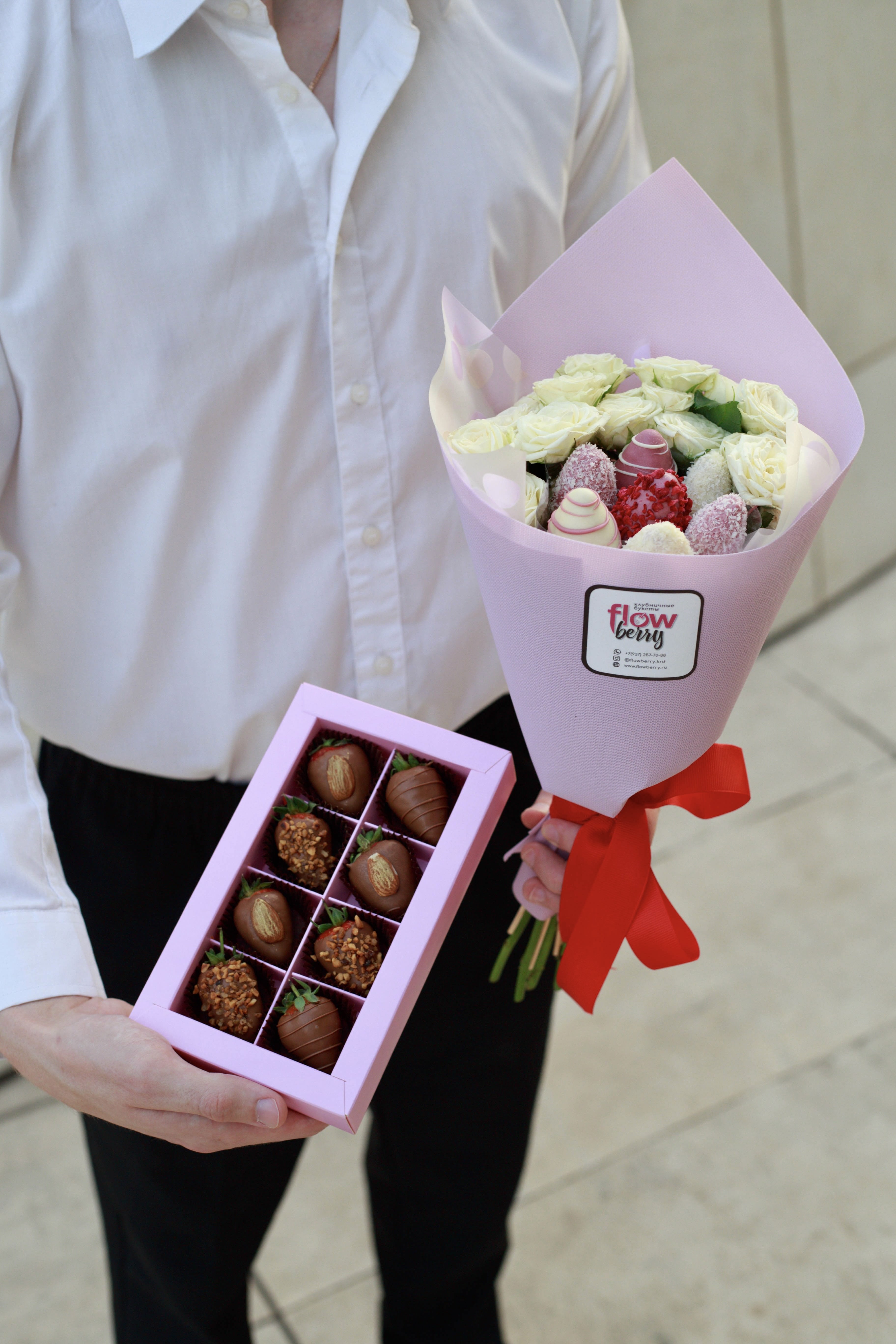 Клубничный «Комбо набор №2» - букет, который обладает исключительной эстетикой благодаря своему оформлению и цветовой палитре