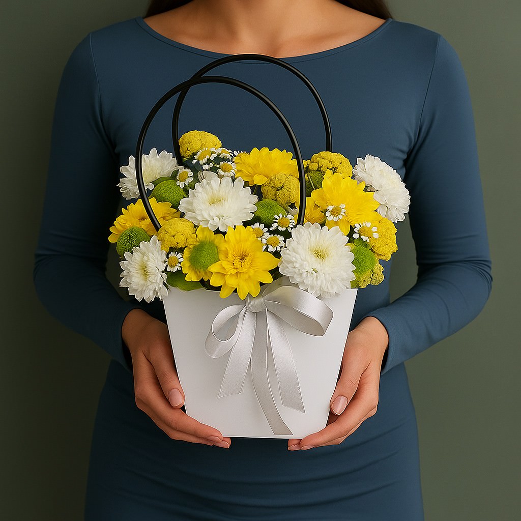 Яркая и позитивная композиция в стильной коробочке с ручками. Настроение радости и тепла в каждом цветке.