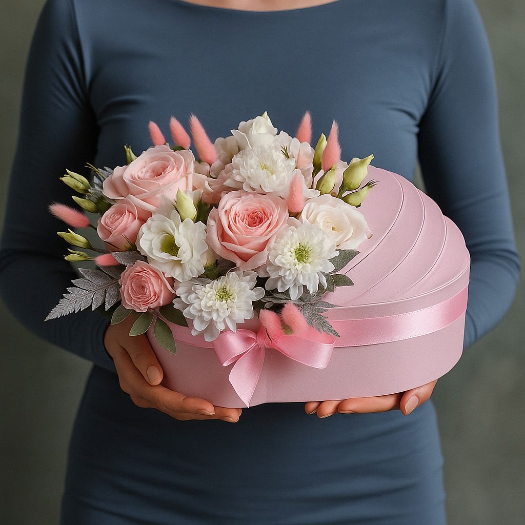 Романтичная композиция в коробке-сердце с розами и белыми цветами — лучший способ выразить любовь и нежность. Такой подарок произведёт неизгладимое впечатление.